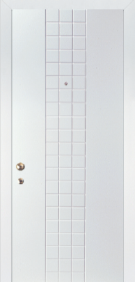 Το κατακόρυφο ανάγλυφο μοτίβο με επαναλαμβανόμενα γεωμετρικά τετράγωνα δημιουργεί ρυθμό και βάθος στην επιφάνεια του θυρόφυλλου, προσφέροντας ένα σύγχρονο και δυναμικό αποτέλεσμα χωρίς υπερβολές.